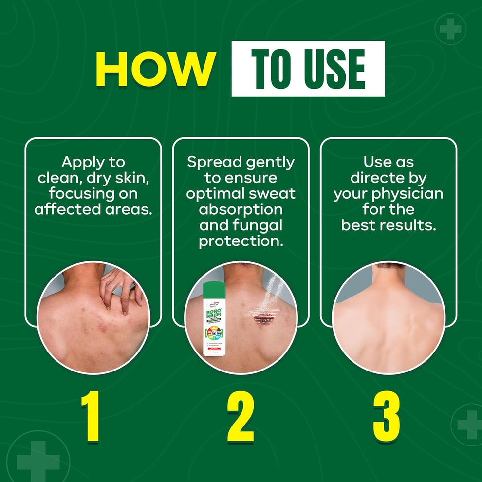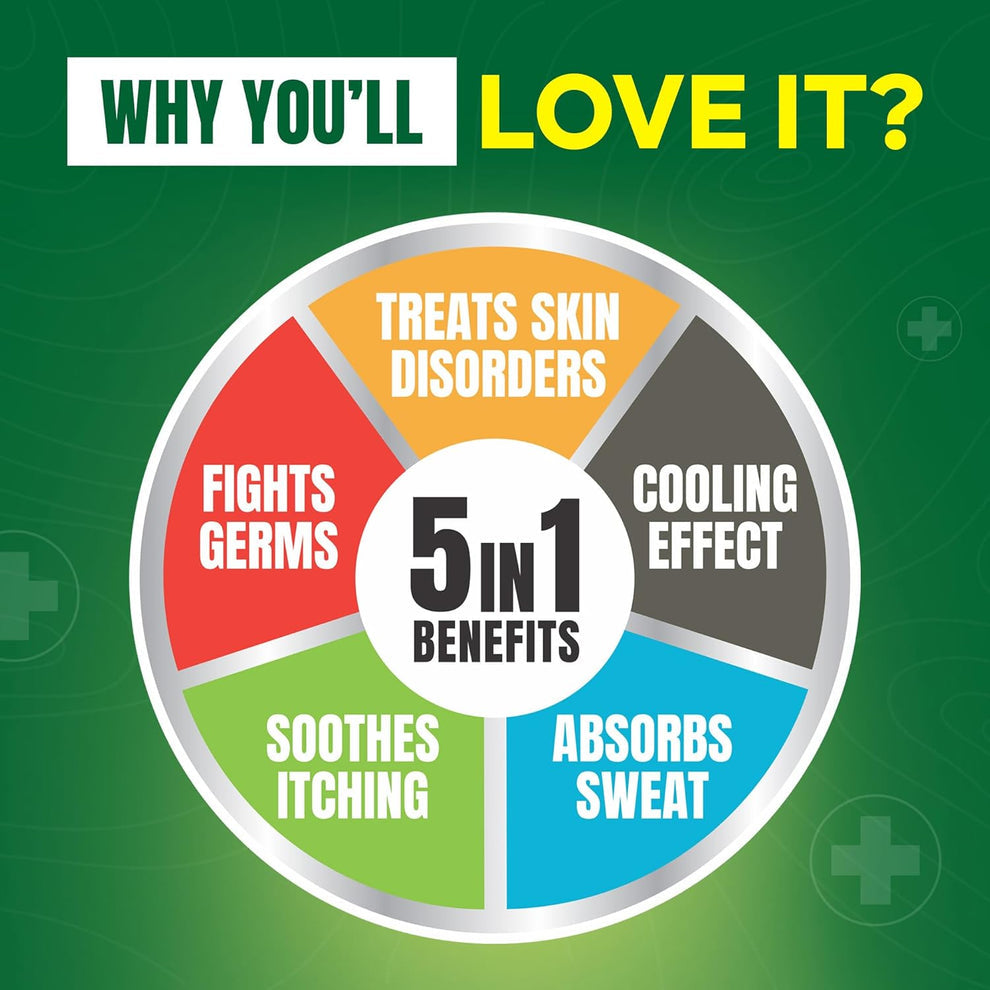 Formulated with the natural goodness of Neem and Boric Acid, this ayurvedic powder provides instant cooling, long-lasting freshness, and protection from fungal infections, itching, and body odor.